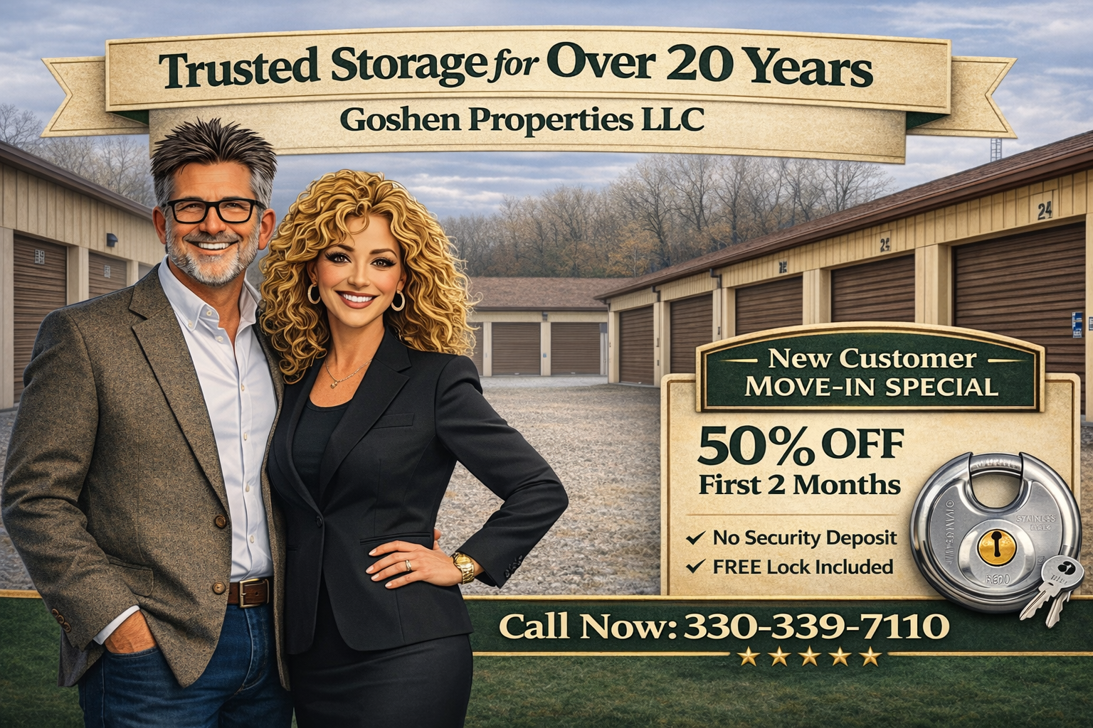 For more than 20 years, Goshen Properties LLC has provided dependable storage solutions to our community. As a locally owned and operated company, we believe in straightforward pricing, clean facilities, and real customer service. Our mission is simple: protect what matters to you.